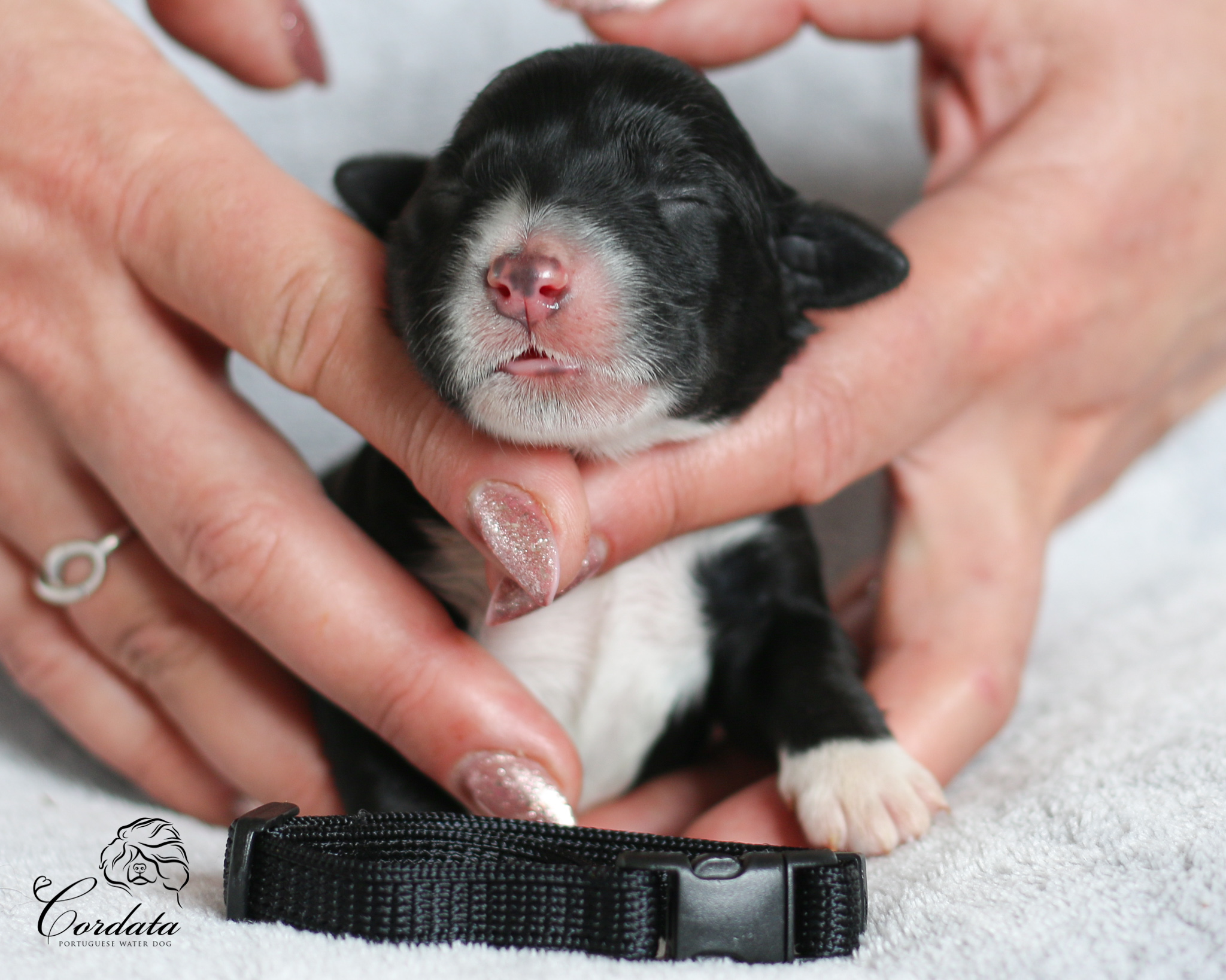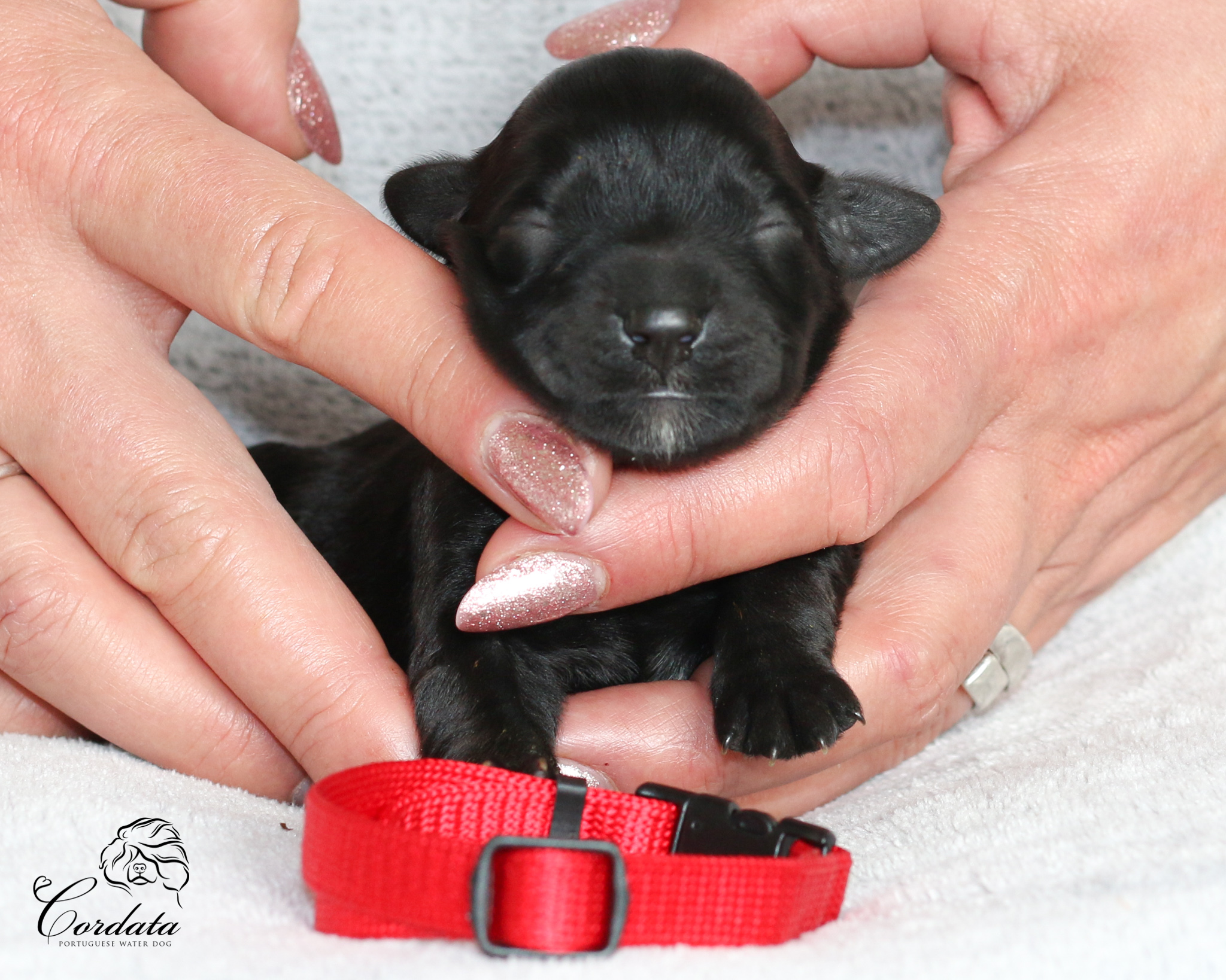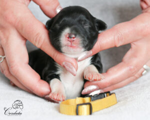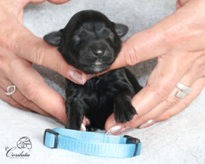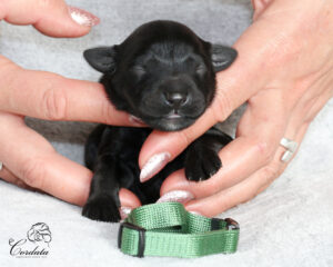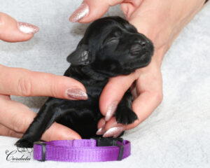 Tara nám nadělila krásný a vyrovnaný vrh. Porod byl ukázkový, vše bylo bez problémů. Váhy štěňátek jsou v rozmezí 350-404 g. Všichni mají wavy kožíšky, dvě holčičky jsou celočerné po Taře a dva kluci jsou celočerní po Montikovi. Máme Dvě krásné znakaté slečny a jednoho znakatého pejska. No a dvě holčičky mají menší bílé znaky na prstech a na hrudníčcích.